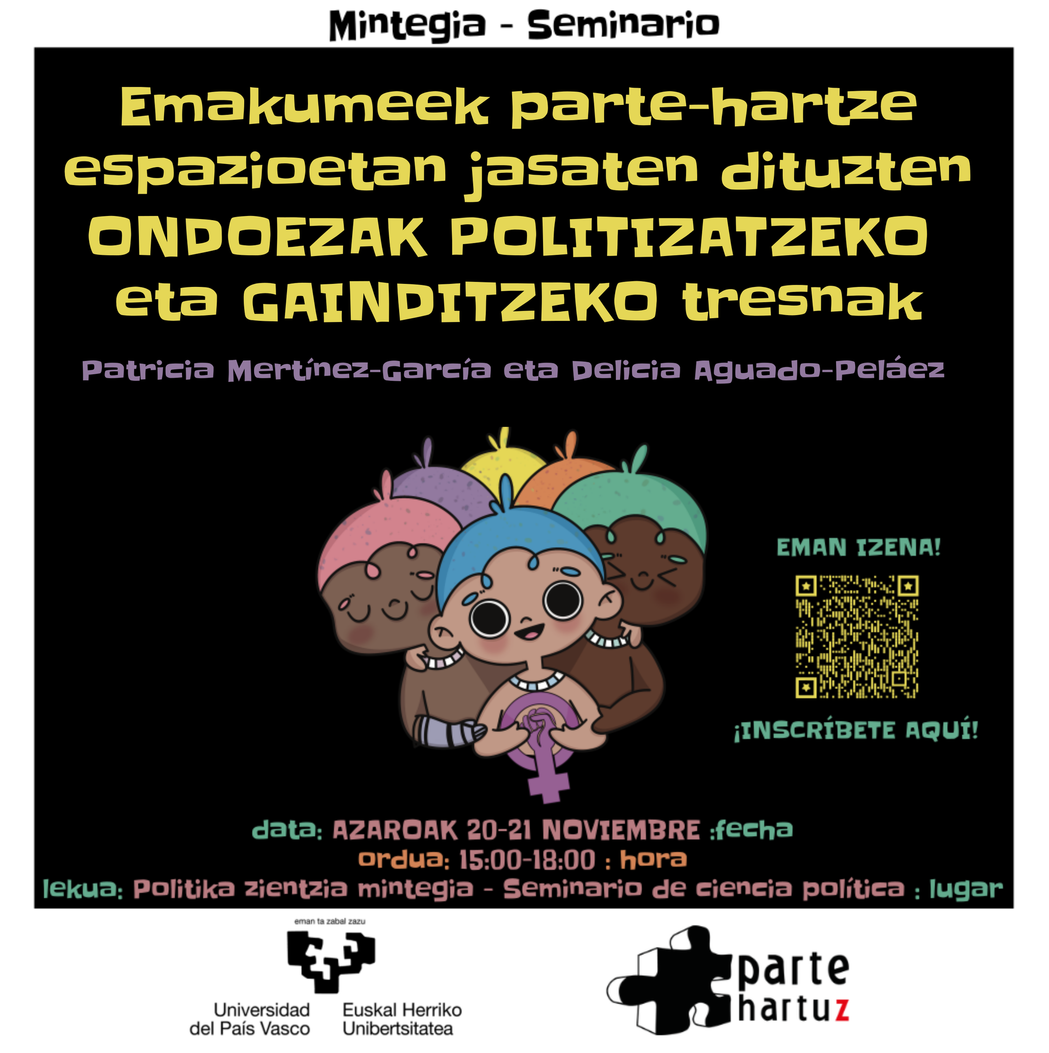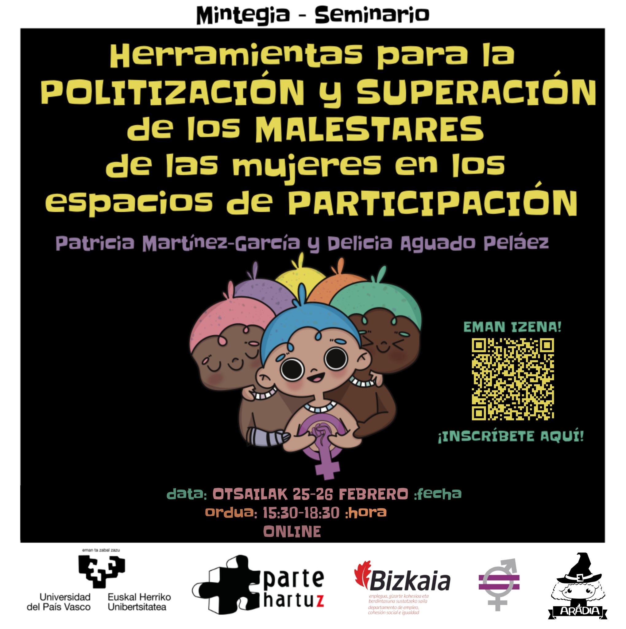 El próximo 25 y 26 de febrero impartiremos un seminario online en el doctorado en Sociedad, Política y Cultura de la UPV/EHU coordinado por Igor Ahedo y titulado: "🔧Herramientas para la politización y superación de los 😞 malestares de las mujeres en los espacios de participación".